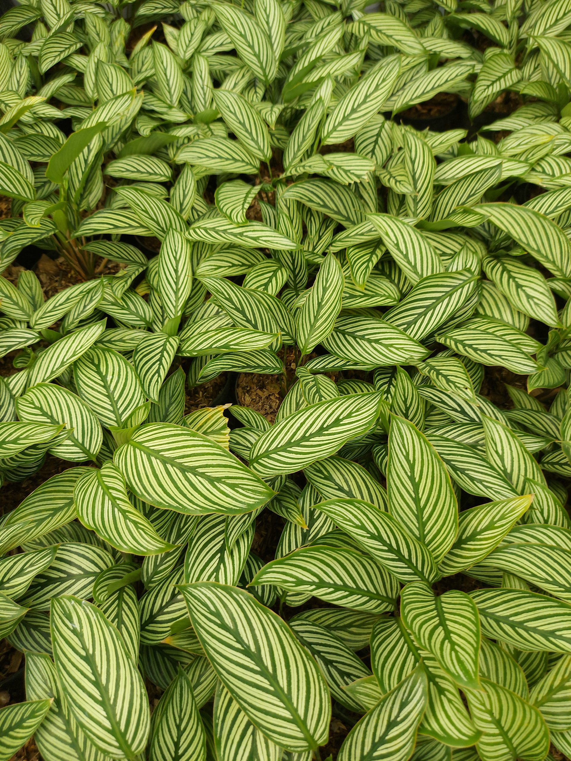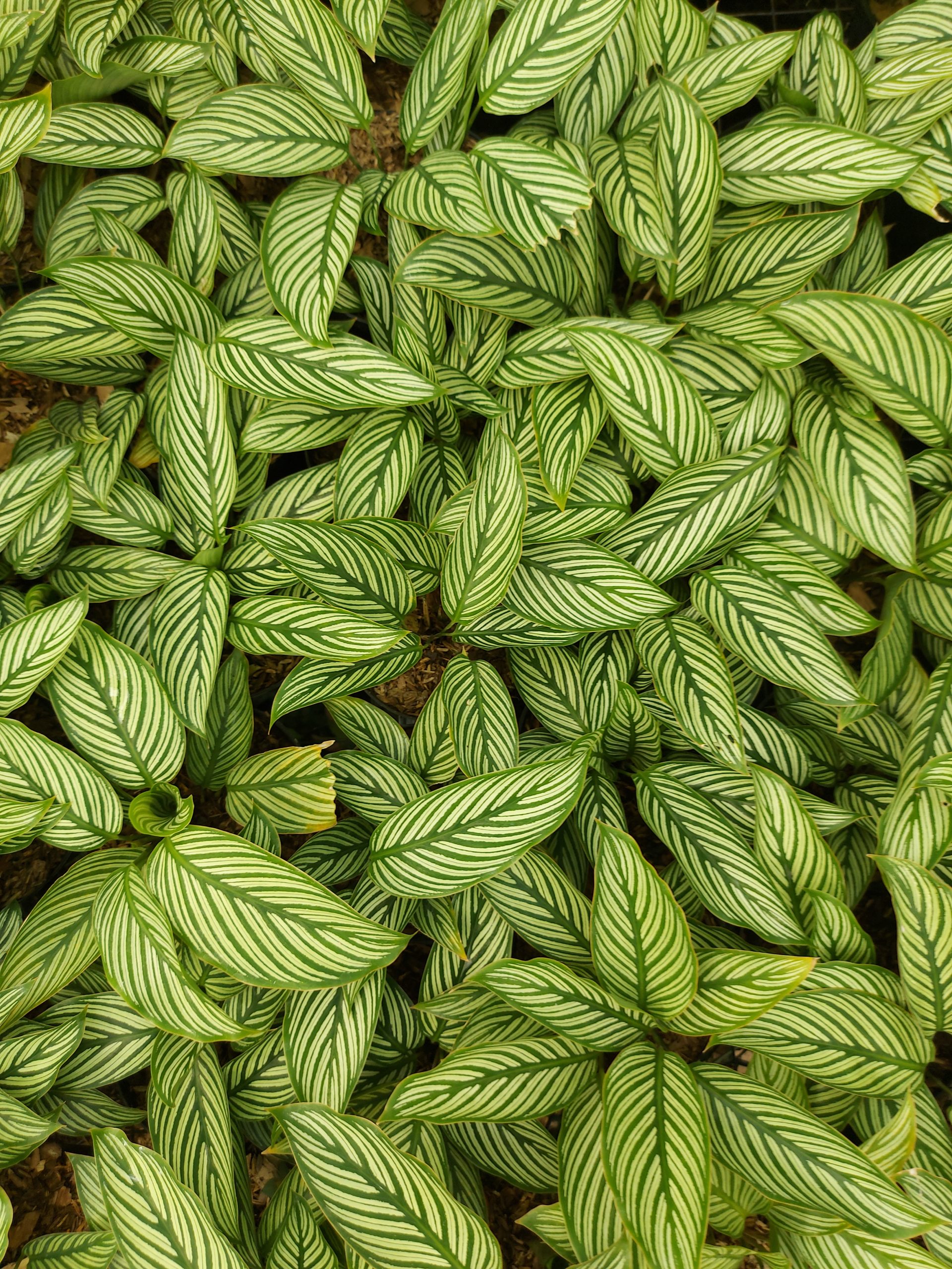 Calathea vittata displays bright green elliptical leaves with numerous sleek, white stripes. Grows in an upright, clumping habit. The common name Prayer Plant refers to the leaves, which tend to fold in at night and open up in bright daylight.